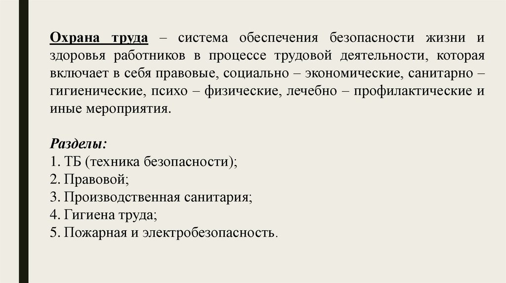 Охрана труда – система обеспечения безопасности жизни издоровья работников в процессе трудовой деятельности, которая