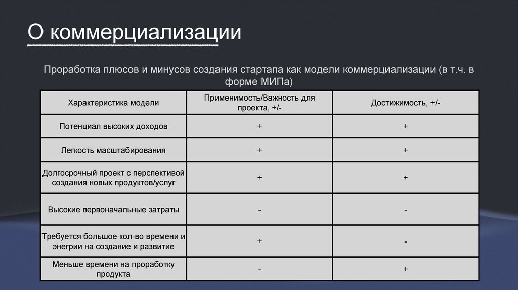 О коммерциализацииПроработка плюсов и минусов создания стартапа как модели коммерциализации (в т.ч. в