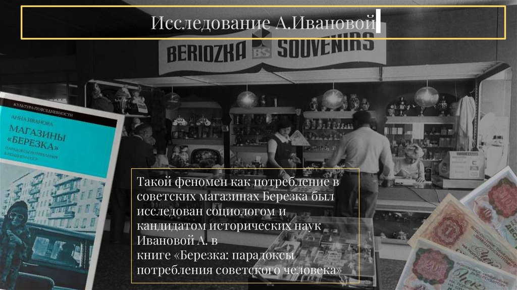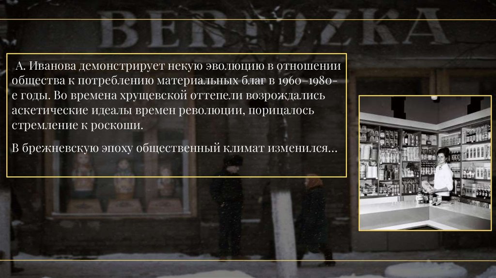 А. Иванова демонстрирует некую эволюцию в отношенииобщества к потреблению материальных благ в 1960–1980е годы. Во времена хрущевской оттепели возрождались