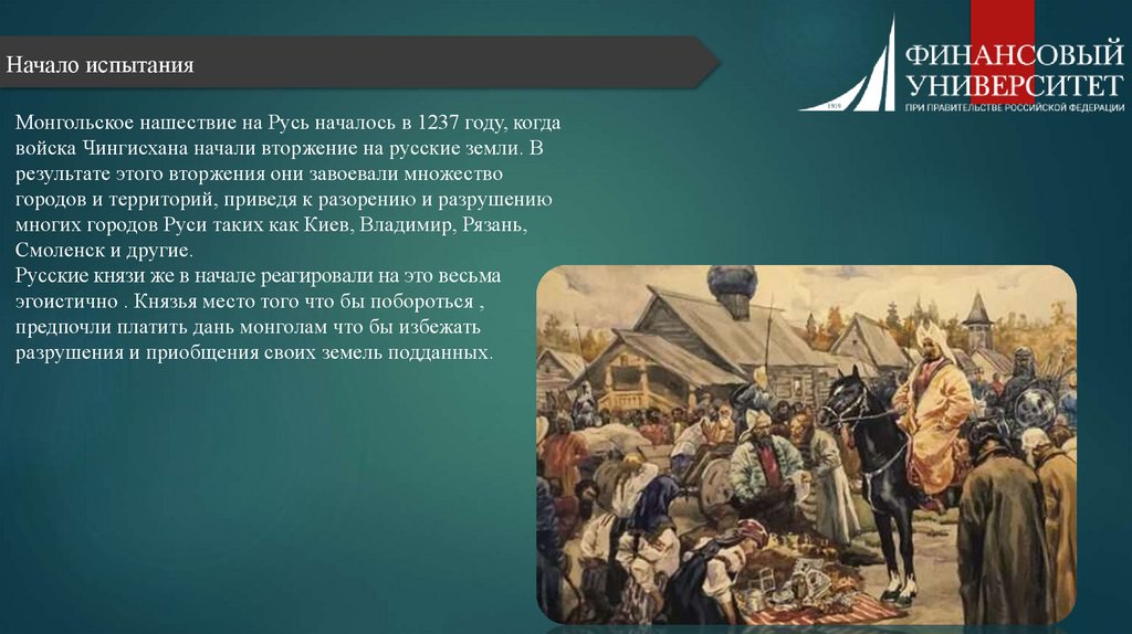Начало испытанияМонгольское нашествие на Русь началось в 1237 году, когда