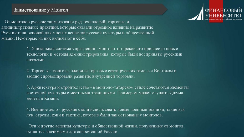 Заимствование у МонголОт монголов русские заимствовали ряд технологий, торговые и