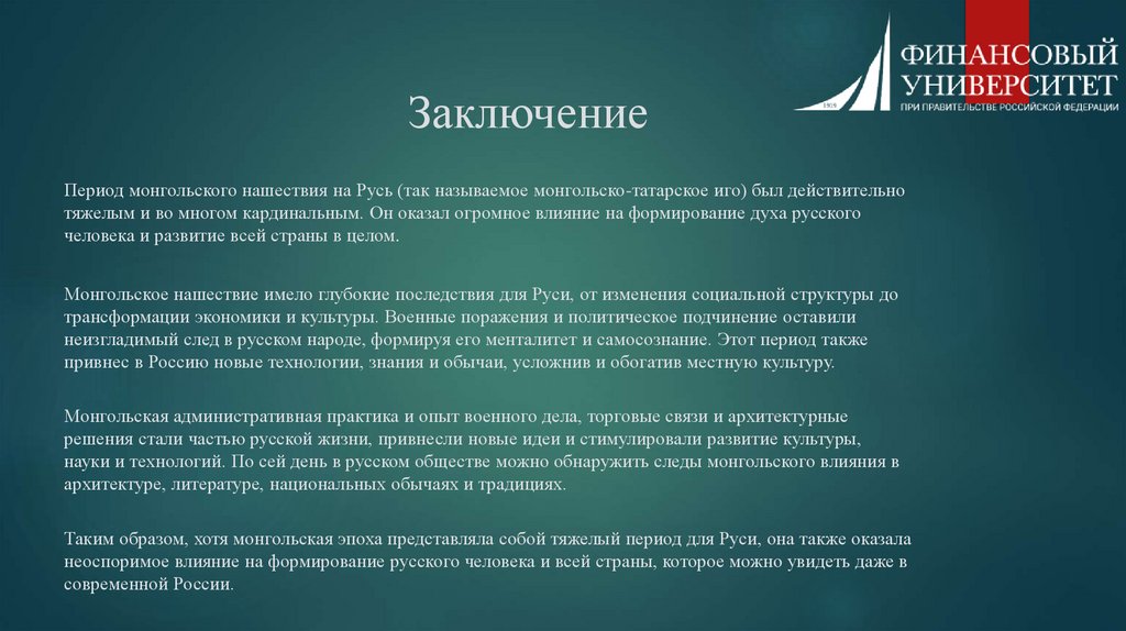 ЗаключениеПериод монгольского нашествия на Русь (так называемое монгольско-татарское иго) был действительно