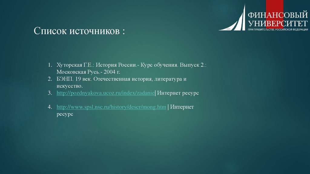 Список источников :1. Хуторская Г.Е.: История России.- Курс обучения. Выпуск 2.: