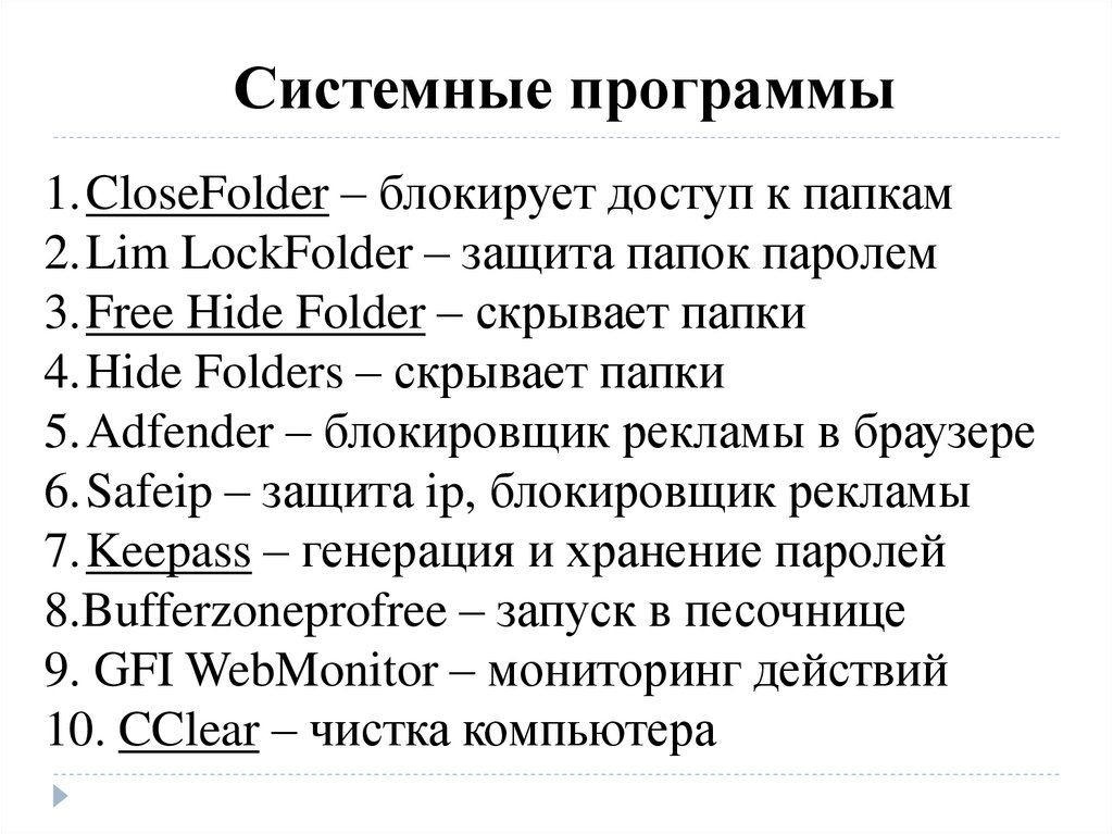 Системные программы1.CloseFolder – блокирует доступ к папкам