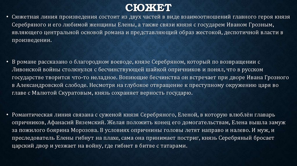 • В романе рассказано о благородном воеводе, князе Серебряном, который по возвращении с