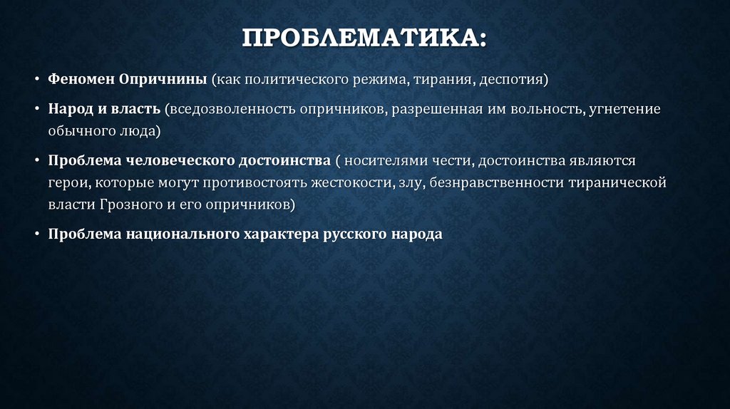 ПРОБЛЕМАТИКА:• Феномен Опричнины (как политического режима, тирания, деспотия)