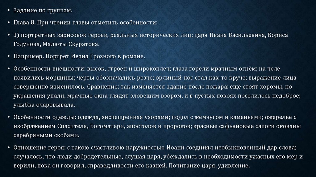 • Задание по группам.• Глава 8. При чтении главы отметить особенности: