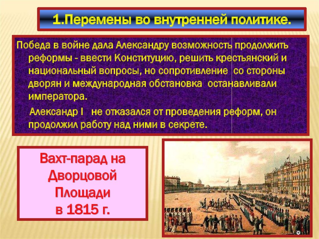 1.Перемены во внутренней политике.Победа в войне дала Александру возможность продолжить