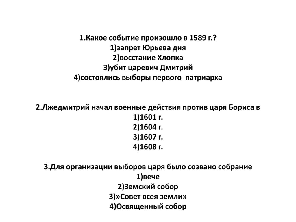 1.Какое событие произошло в 1589 г.?1)запрет Юрьева дня