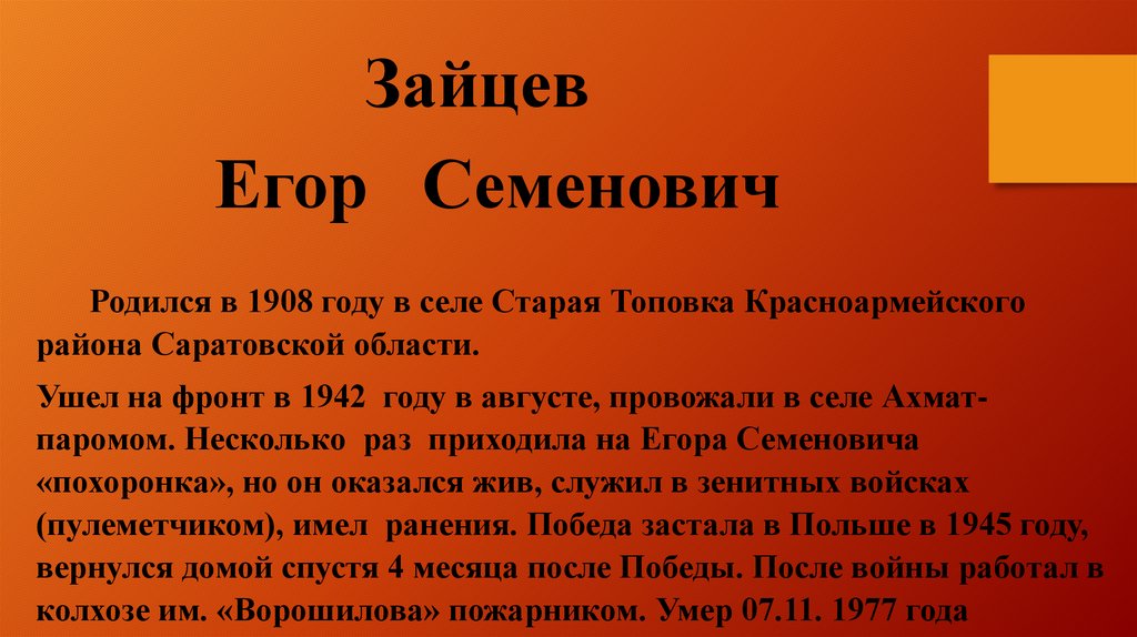 Ушел на фронт в 1942 году в августе, провожали в селе Ахматпаромом. Несколько раз приходила на Егора Семеновича