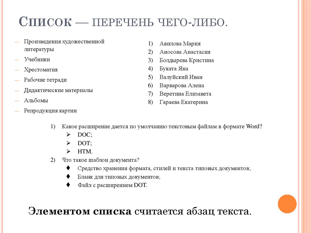 Элементом списка считается абзац текста.