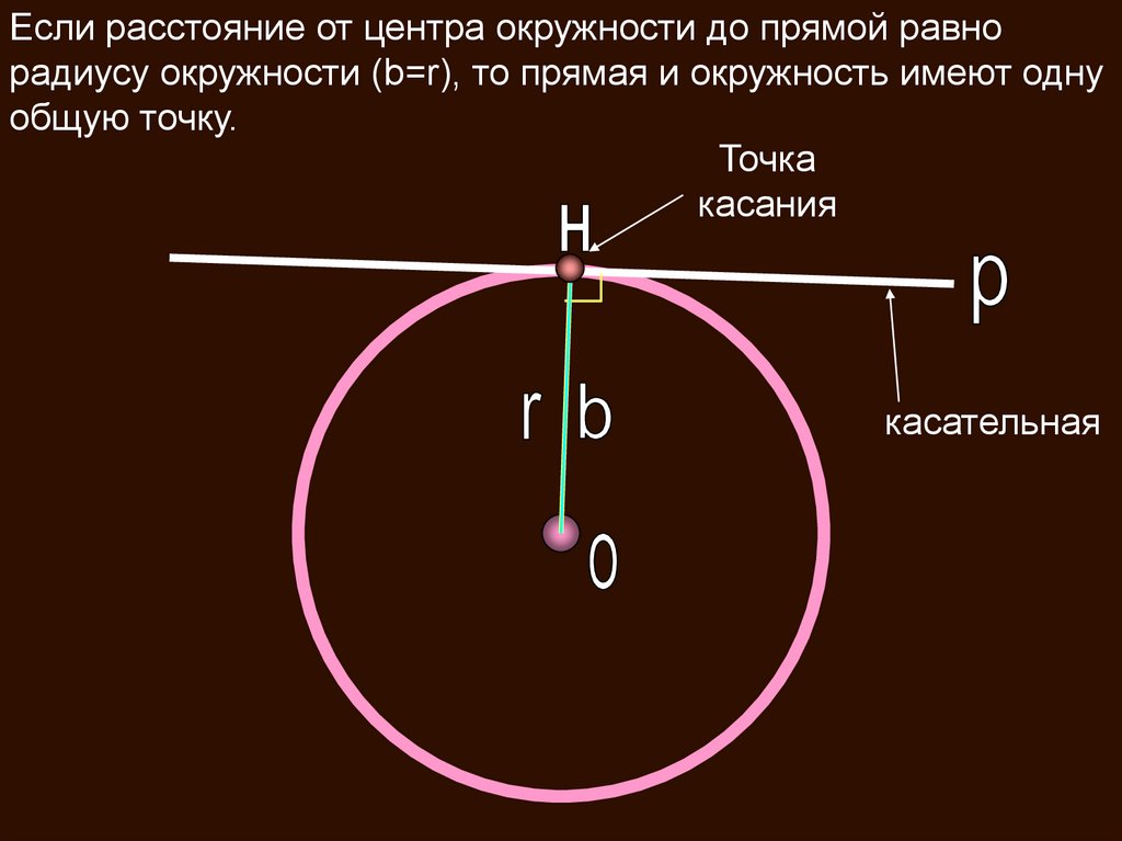 Если расстояние от центра окружности до прямой равнорадиусу окружности (b=r), то прямая и окружность имеют одну
