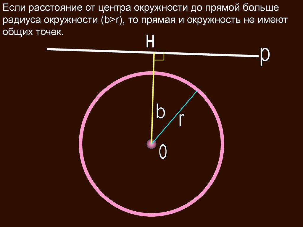 Если расстояние от центра окружности до прямой большерадиуса окружности (b>r), то прямая и окружность не имеют
