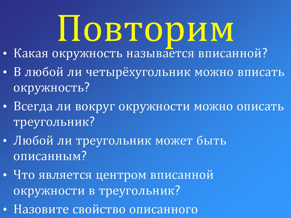 • Какая окружность называется вписанной?• В любой ли четырёхугольник можно вписать