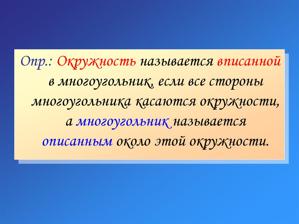 Опр.: Окружность называется вписаннойв многоугольник, если все стороны