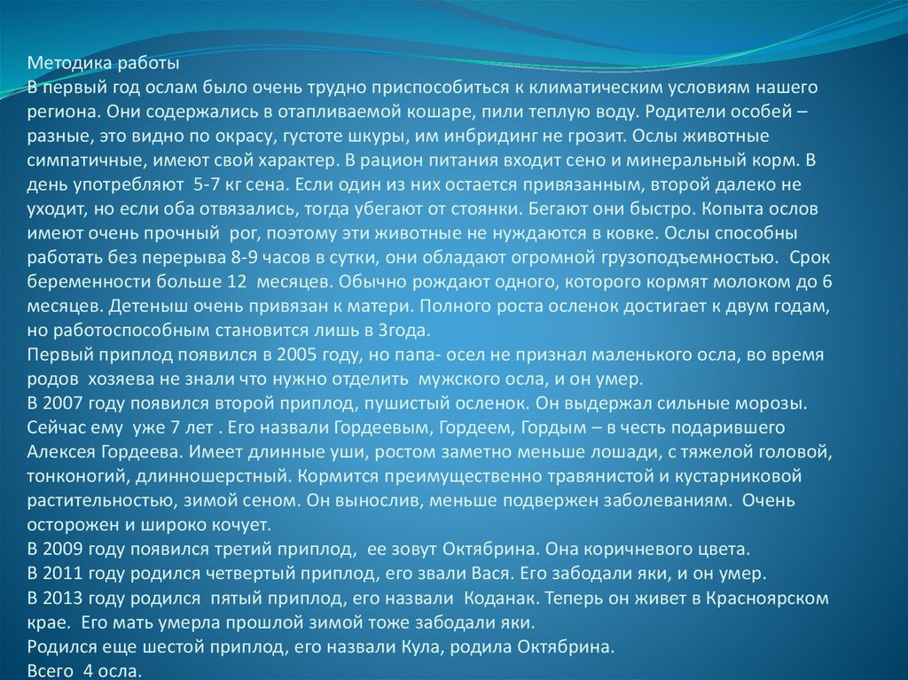 Методика работыВ первый год ослам было очень трудно приспособиться к климатическим условиям нашего