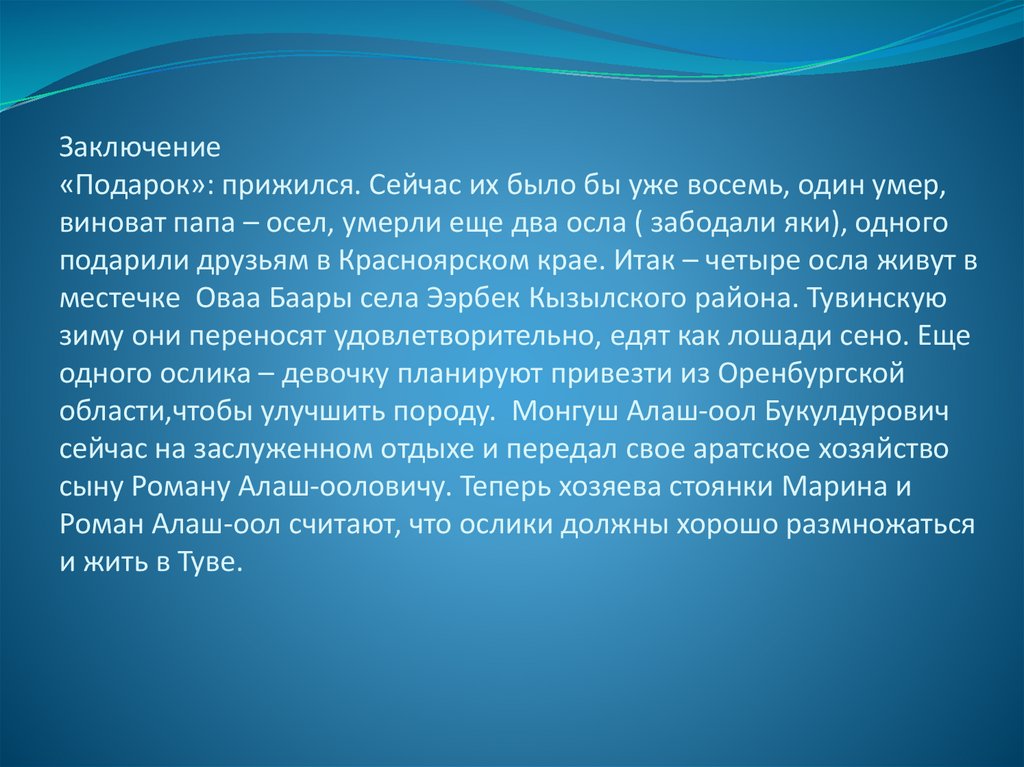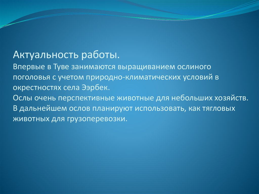 Актуальность работы.Впервые в Туве занимаются выращиванием ослиного