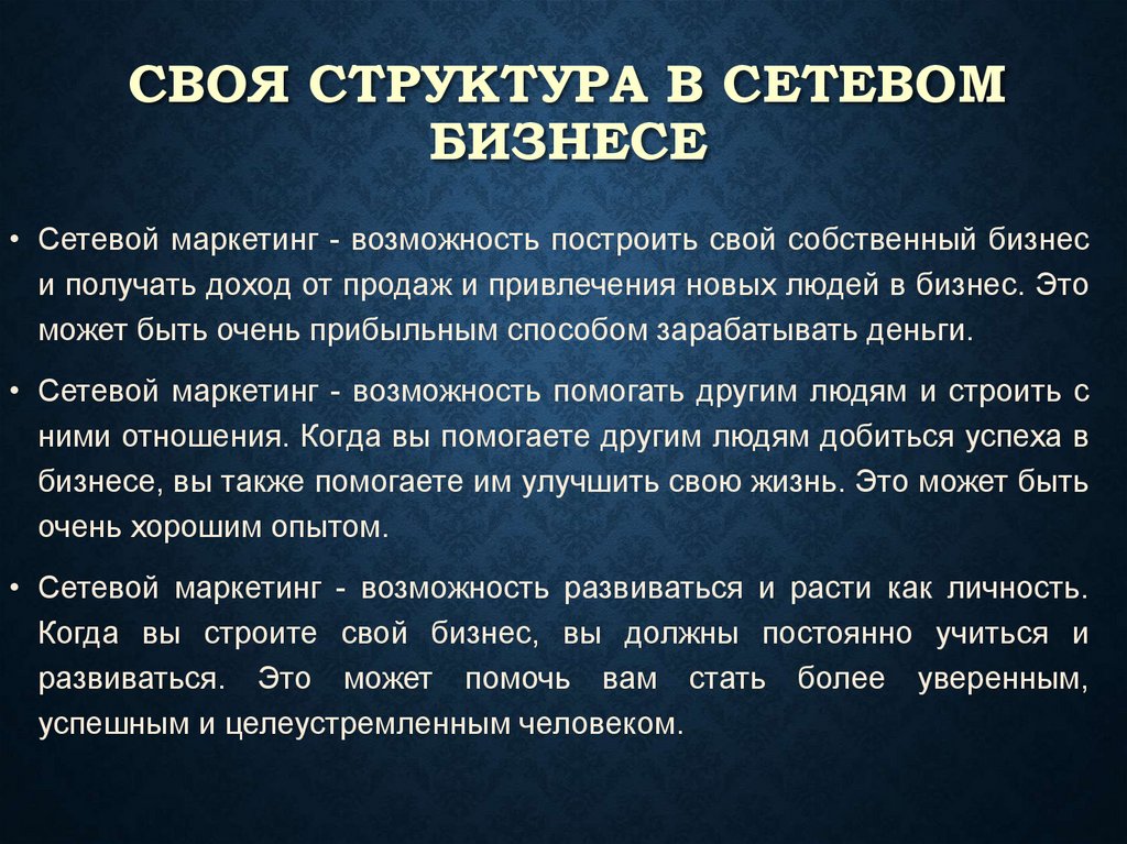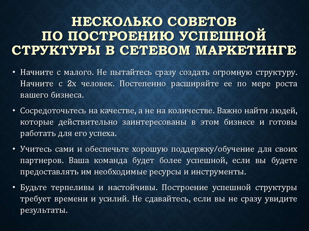 • Построение успешной структуры в сетевом маркетинге требует