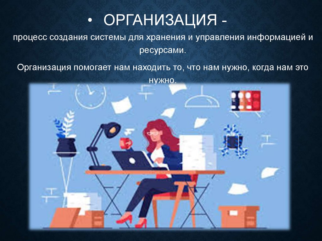 • ОРГАНИЗАЦИЯ процесс создания системы для хранения и управления информацией иресурсами.
