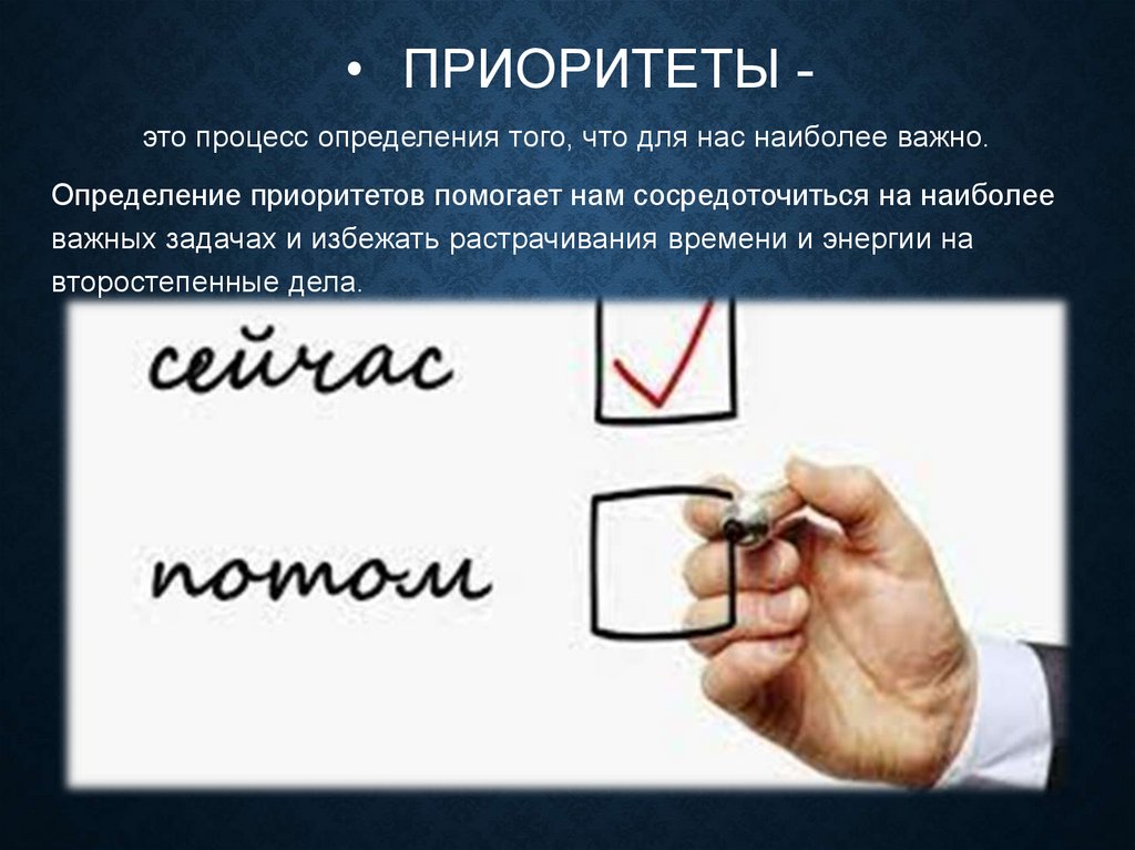 • ПРИОРИТЕТЫ это процесс определения того, что для нас наиболее важно.Определение приоритетов помогает нам сосредоточиться на наиболее