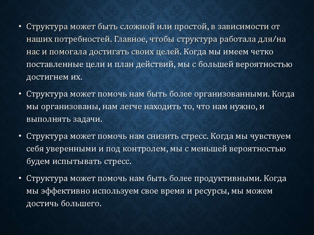 • Структура может помочь нам снизить стресс. Когда мы чувствуем