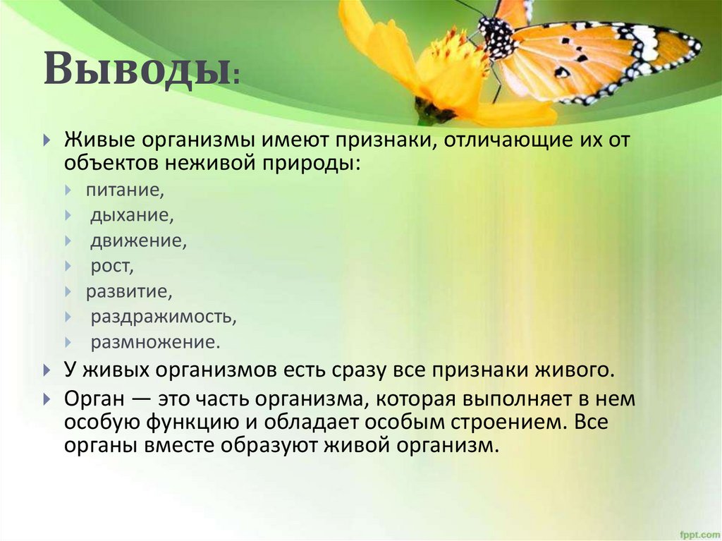 Выводы:Живые организмы имеют признаки, отличающие их от