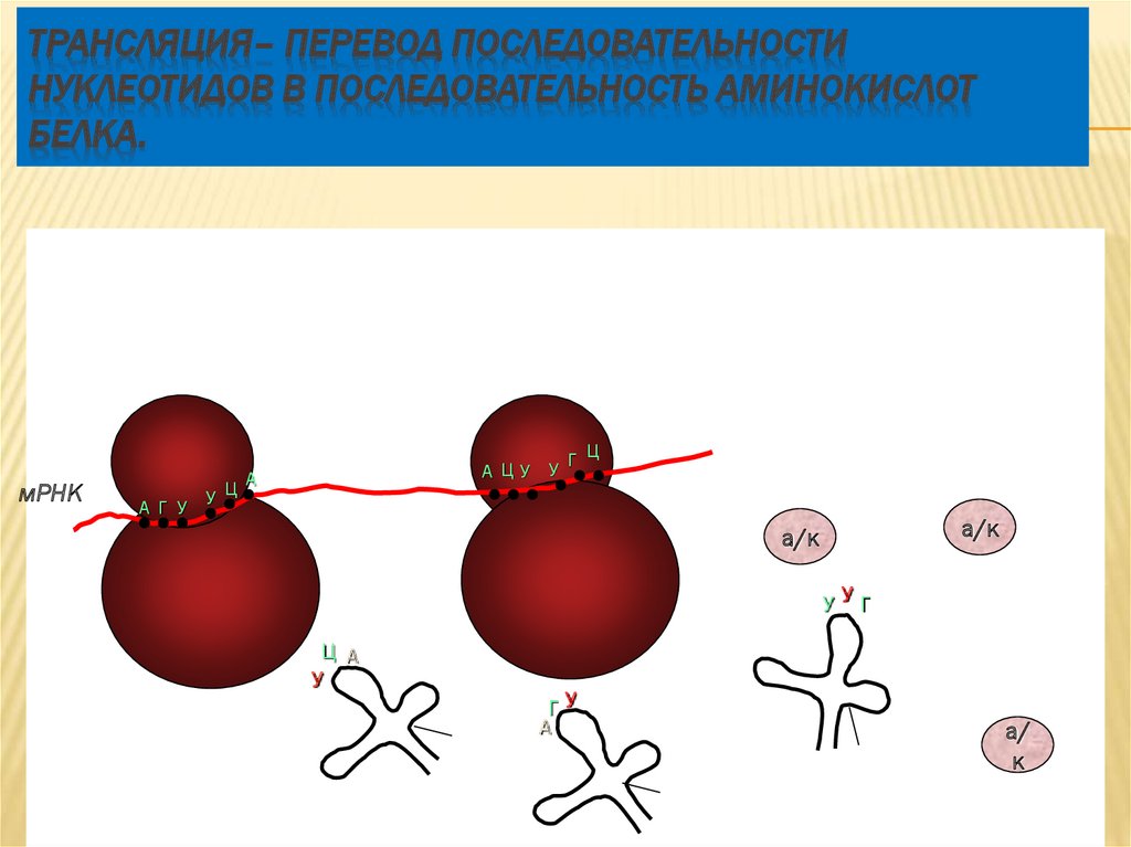 ТРАНСЛЯЦИЯ– ПЕРЕВОД ПОСЛЕДОВАТЕЛЬНОСТИНУКЛЕОТИДОВ В ПОСЛЕДОВАТЕЛЬНОСТЬ АМИНОКИСЛОТ