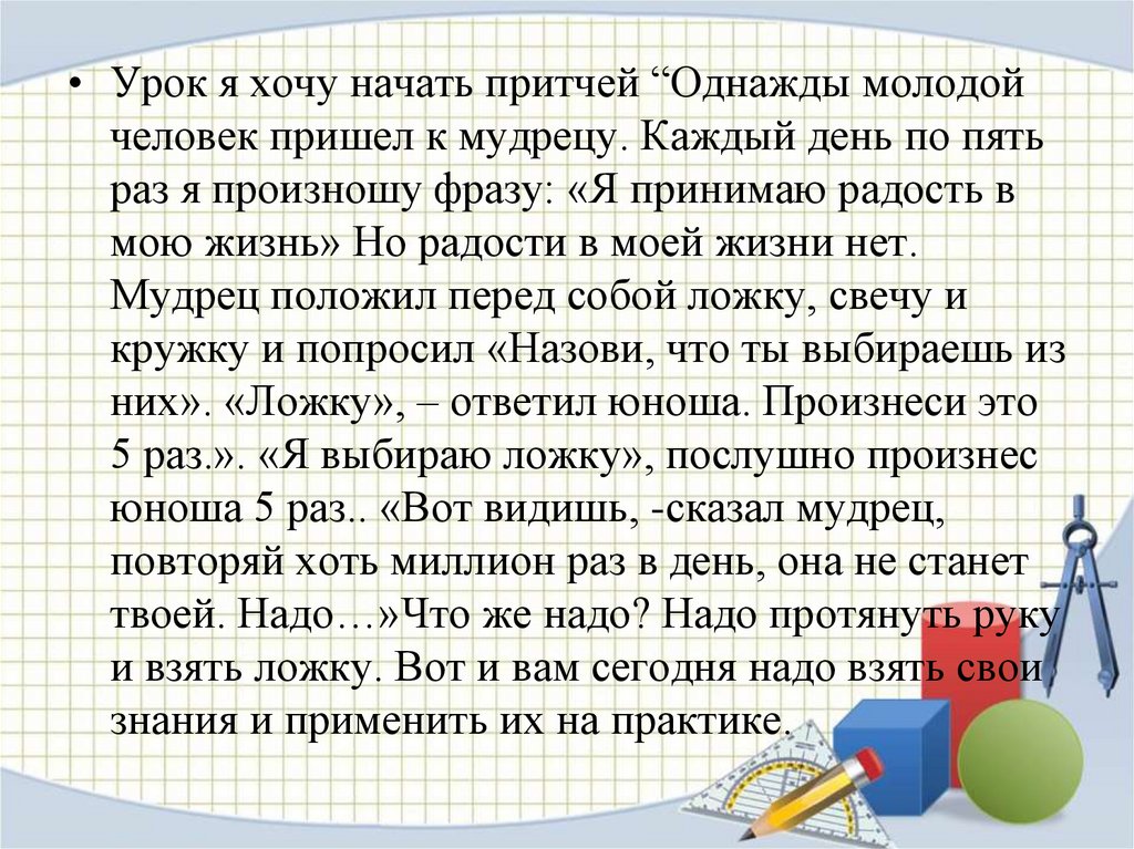 • Урок я хочу начать притчей “Однажды молодойчеловек пришел к мудрецу. Каждый день по пять