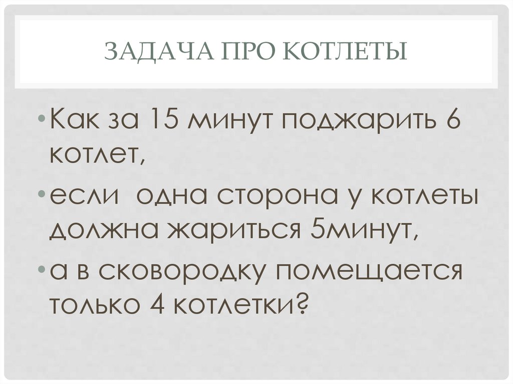 ЗАДАЧА ПРО КОТЛЕТЫ• Как за 15 минут поджарить 6