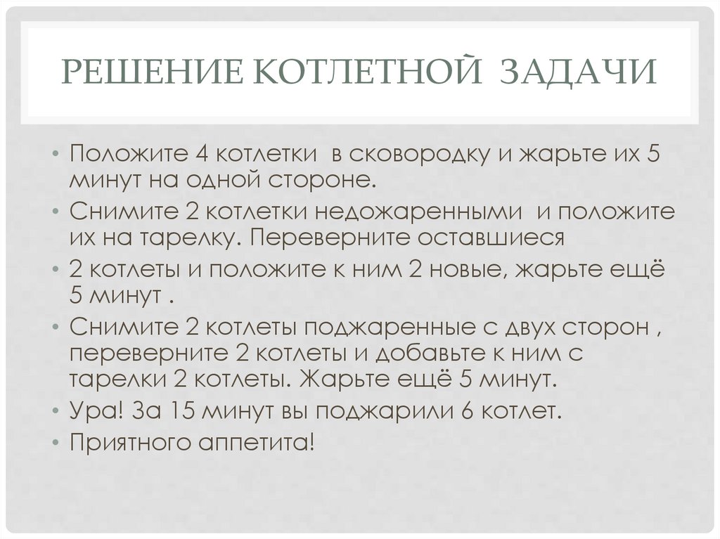 РЕШЕНИЕ КОТЛЕТНОЙ ЗАДАЧИ• Положите 4 котлетки в сковородку и жарьте их 5