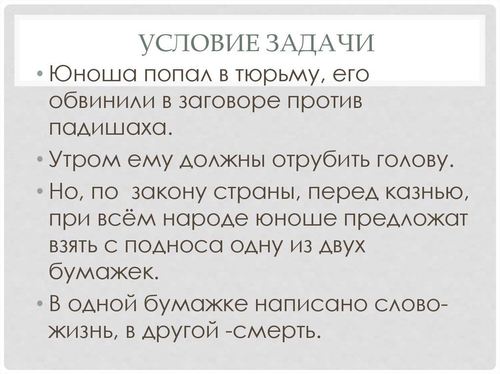УСЛОВИЕ ЗАДАЧИ• Юноша попал в тюрьму, его