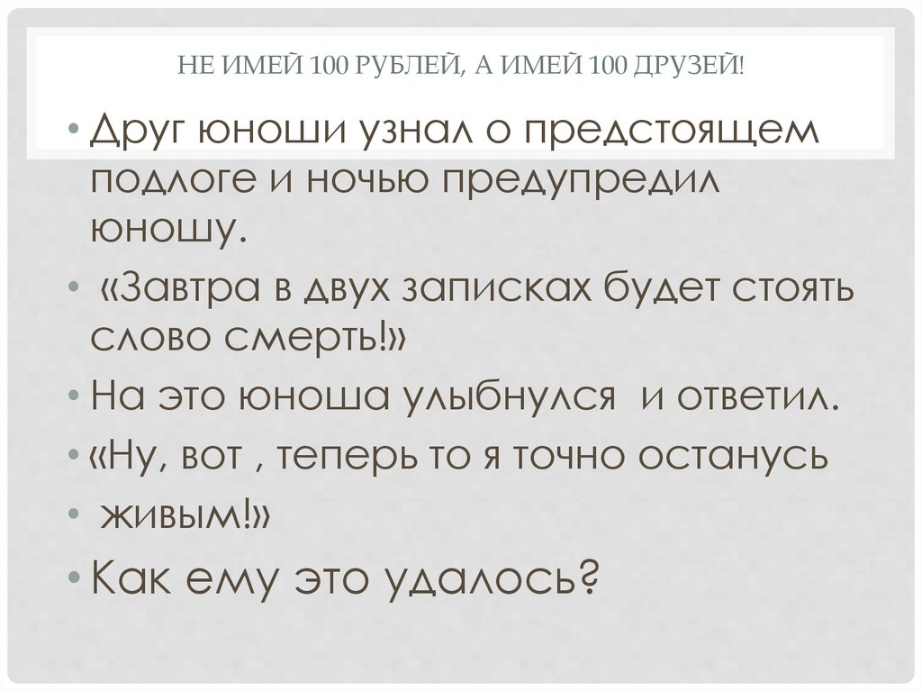 НЕ ИМЕЙ 100 РУБЛЕЙ, А ИМЕЙ 100 ДРУЗЕЙ!• Друг юноши узнал о предстоящем