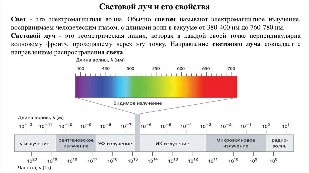 Световой луч и его свойстваСвет - это электромагнитная волна. Обычно светом называют электромагнитное излучение,