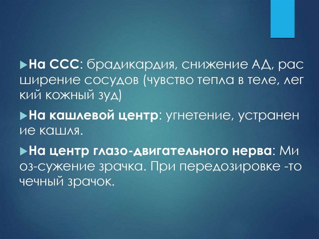На ССС: брадикардия, снижение АД, расширение сосудов (чувство тепла в теле, лег