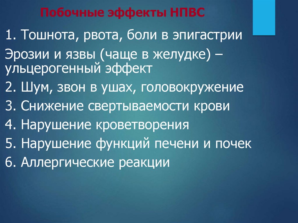 Побочные эффекты НПВС1. Тошнота, рвота, боли в эпигастрии