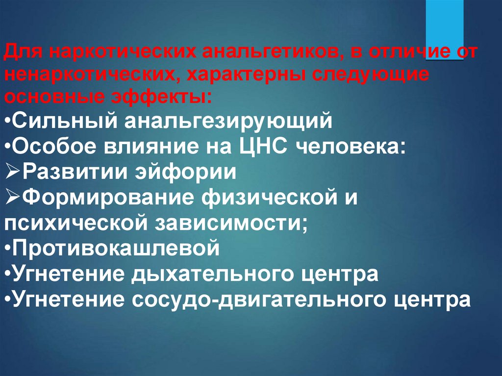 Для наркотических анальгетиков, в отличие отненаркотических, характерны следующие