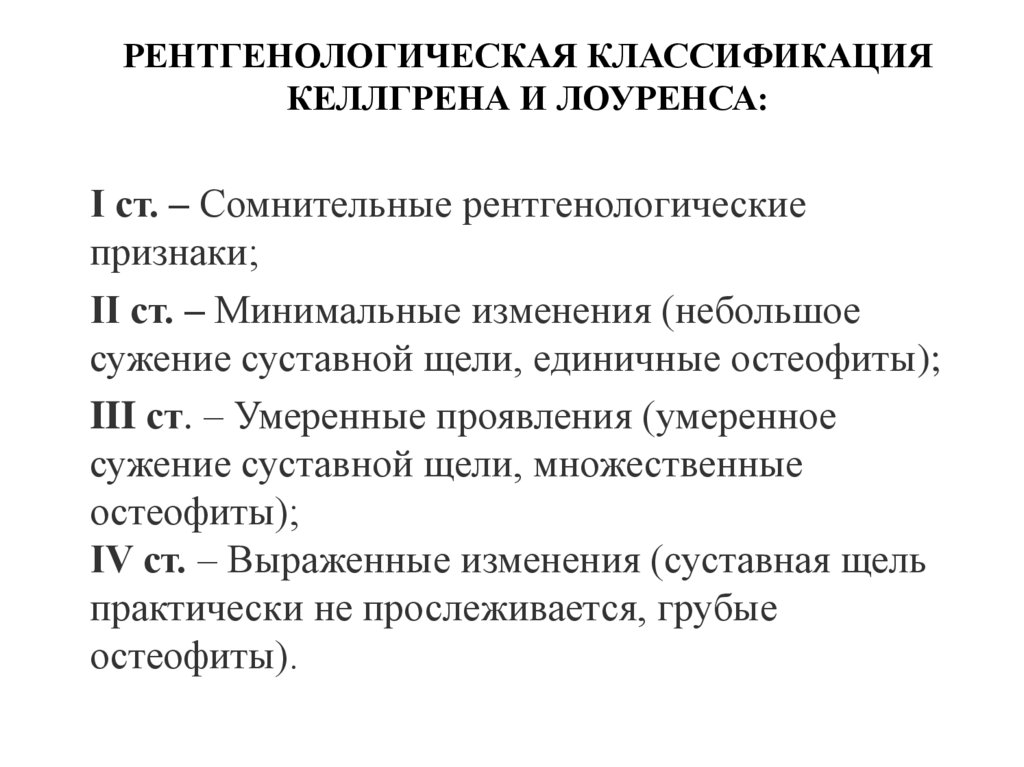 Остеоартроз. Рентгенологическая классификация Келлгрена и Лоуренса