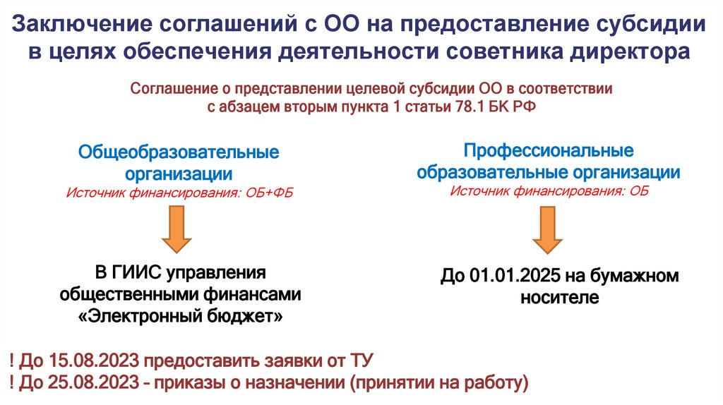 Заключение соглашений с ОО на предоставление субсидиив целях обеспечения деятельности советника директора