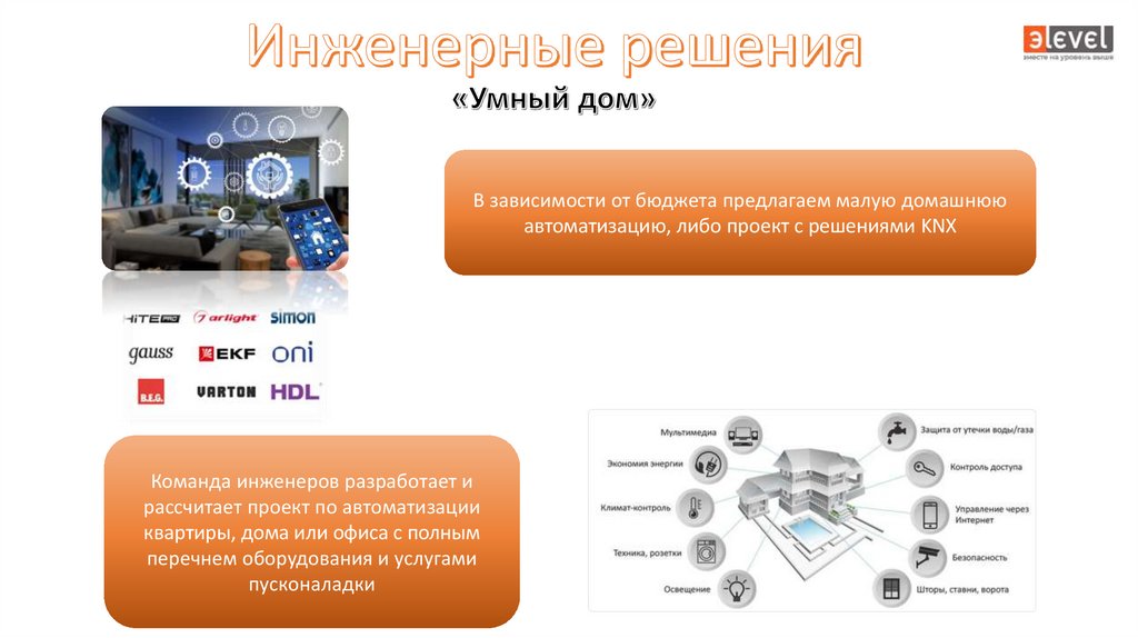 В зависимости от бюджета предлагаем малую домашнююавтоматизацию, либо проект с решениями KNX