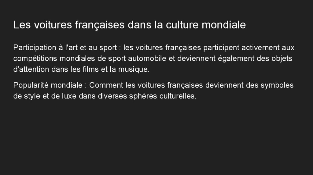 Les voitures françaises dans la culture mondialeParticipation à l'art et au sport : les voitures françaises participent activement aux