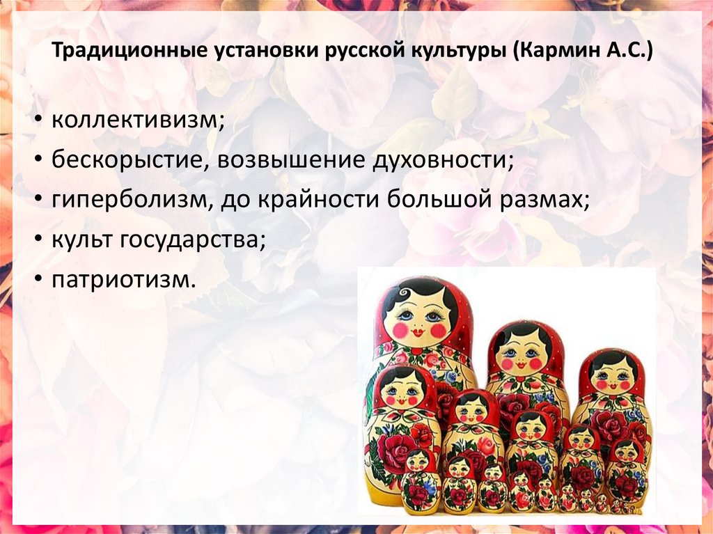 Традиционные установки русской культуры (Кармин А.С.)• коллективизм;