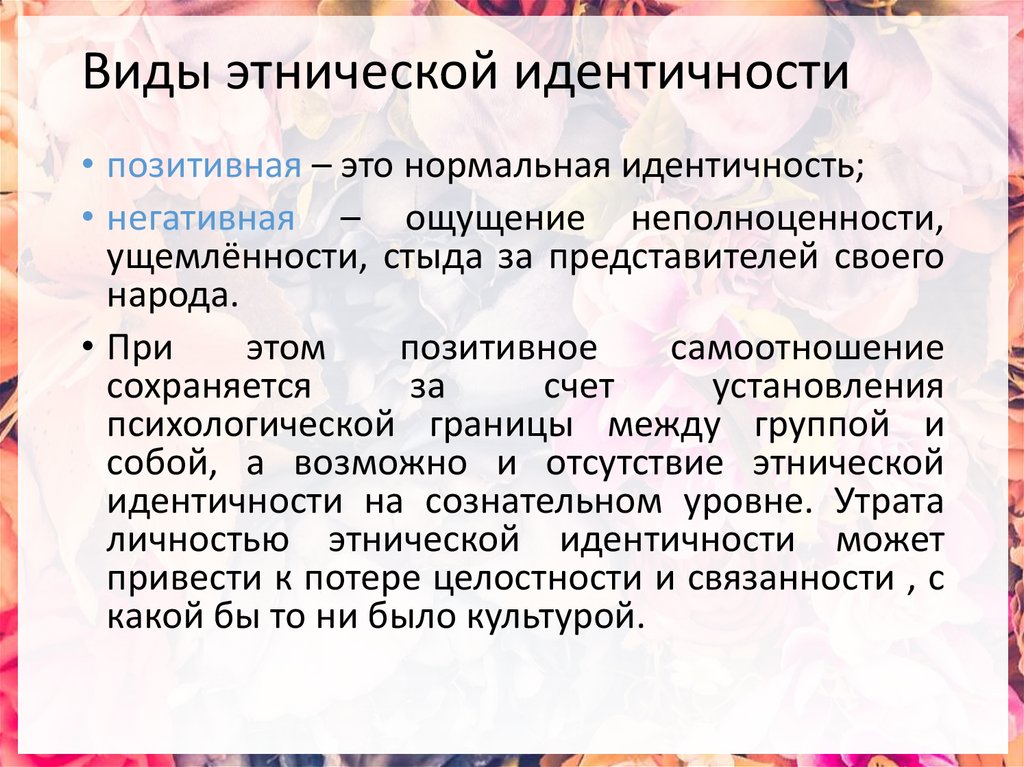 Виды этнической идентичности• позитивная – это нормальная идентичность;
