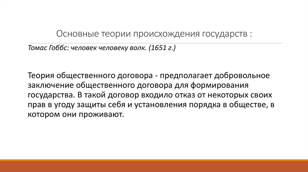 Основные теории происхождения государств :Томас Гоббс: человек человеку волк. (1651 г.)