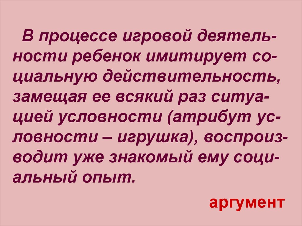 В процессе игровой деятельности ребенок имитирует социальную действительность,замещая ее всякий раз ситуацией условности (атрибут условности – игрушка), воспроизводит уже знакомый ему социальный опыт.