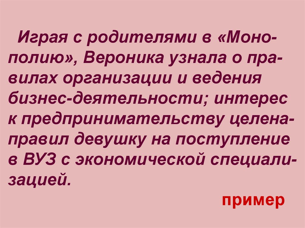 Играя с родителями в «Монополию», Вероника узнала о правилах организации и ведениябизнес-деятельности; интерес