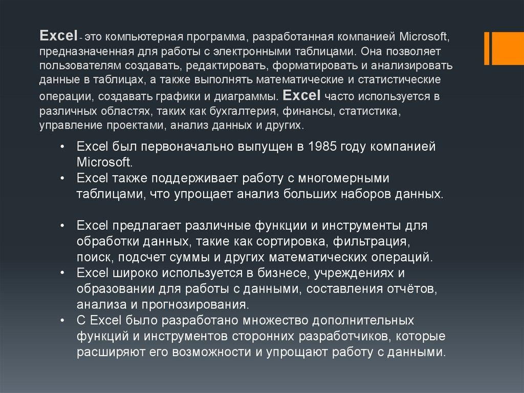 Excel - это компьютерная программа, разработанная компанией Microsoft,предназначенная для работы с электронными таблицами. Она позволяет