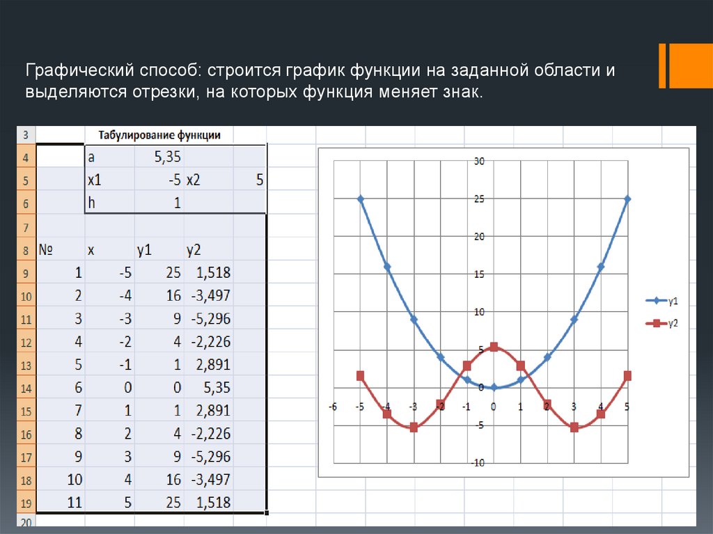 Графический способ: строится график функции на заданной области ивыделяются отрезки, на которых функция меняет знак.