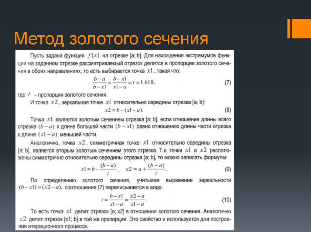 Метод дихотомии(раздвоенность) состоит в делении пополам отрезка