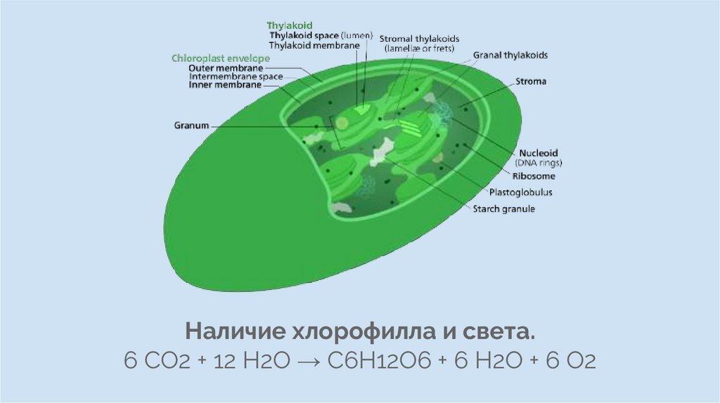 Наличие хлорофилла и света.6 СО2 + 12 Н2О → С6Н12О6 + 6 Н2О + 6 О2