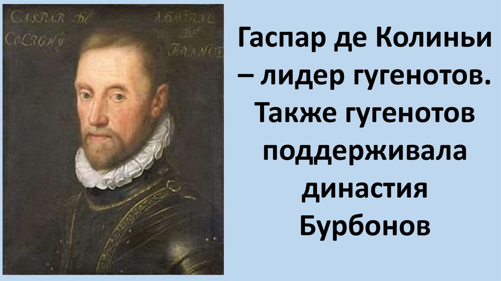 Гаспар де Колиньи– лидер гугенотов.
